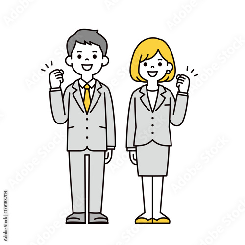 ガッツポーズをする、20代・30代のビジネスマンの男性と女性の全身ベクターイラスト素材セット