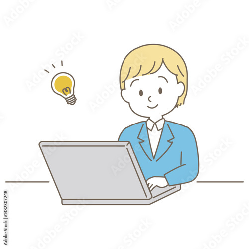 20~40代、スーツ着用女性のビジネスシーン、シンプルかわいい線タイプ(アイデアが浮かぶ・白背景)