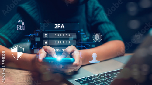 2FA increases the security of your account, a Two-Factor Authentication futuristic virtual interface screen displaying a 2FA concept, Privacy protects data and cybersecurity.