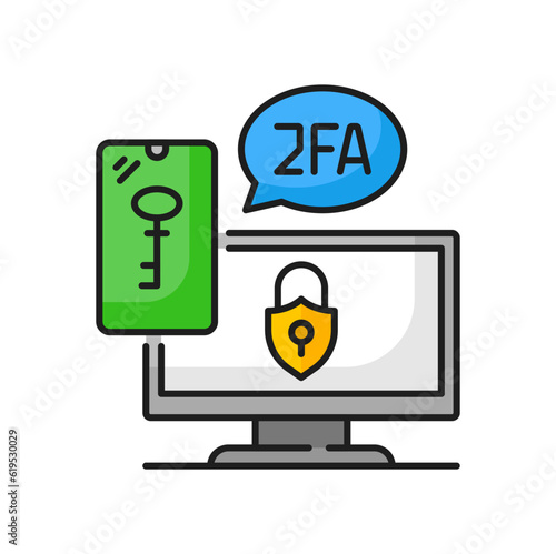 2FA two factor verification, key and lock, secure password and two-factor authentication. Vector security code and computer screen, checking entrance