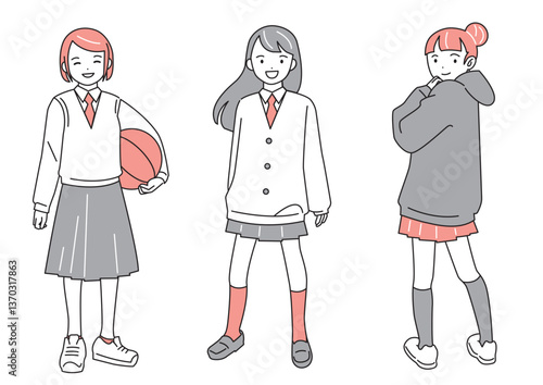 女子学生3人の全身図セット