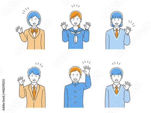 笑顔で手を振る制服姿の学生・男女上半身セット 3色