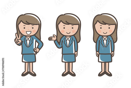 ブルー系のスーツ姿のビジネスウーマンの3ポーズセット_ピース_案内_説明