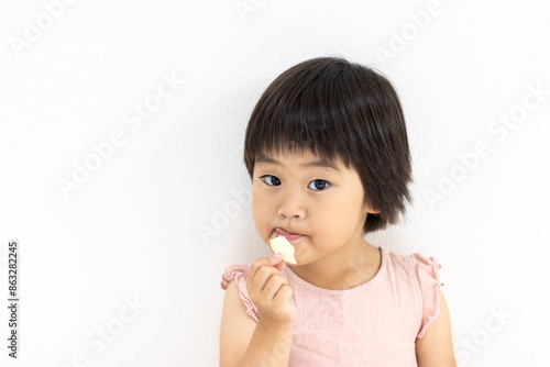 ポテトチップスを食べて舌を出す女の子(3歳、日本人、ショートヘア)