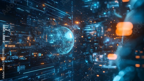 30. A high-tech internet interface with floating 3D elements and virtual data streams