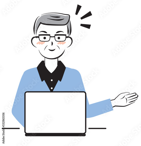 パソコン操作で案内するシニア男性 3c