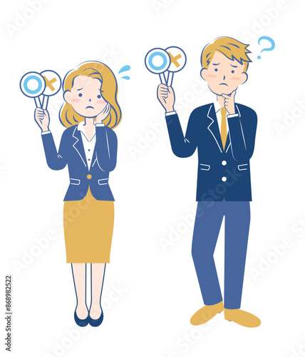 マルバツの札を持つスーツ姿の男女 正解 不正解 悩む 3C