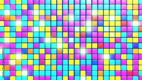 3d abstract simple geometric background with multicolor cubes. Random cubes flash with neon light on plane. Creative simple motion design background with 3d objects. 3d render