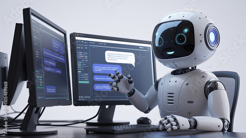 3D AI chatbots interacting and chatting on a computer screen, showcasing advanced technology, digital communication, and artificial intelligence in a futuristic setting, isolated on a clean white