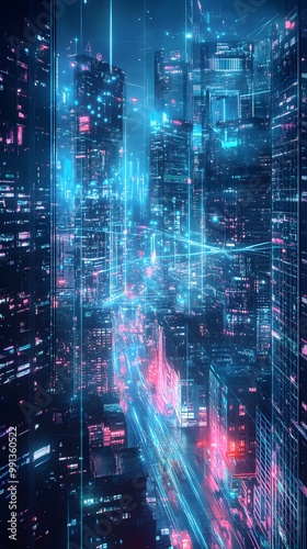 3D cityscape with glowing digital connections, representing the power of technology in urban development