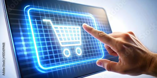 3D Close-Up of Hand Tapping Futuristic Holographic Product Option on Digital Display for Cyber Monday Shopping - Macro Shot Capturing Glowing Interaction
