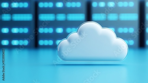 3D cloud symbol in front of servers, representing cloud computing and data storage technology, with blue tones and soft focus background.