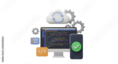 3d computer and phone with coding app on transparent background