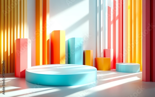 3D data visualization featuring vibrant pastelcolored graphs and pie charts, casting playful shadows on a white surface, symbolizing innovation and analytics