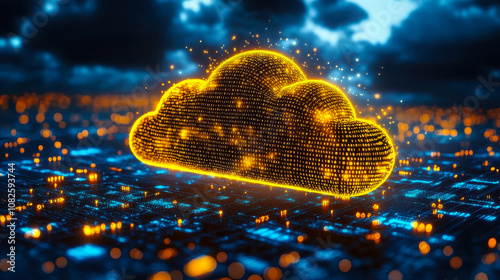 3D Digital Cloud with Glowing Binary Code for AI in Cloud Computing and Data Processing