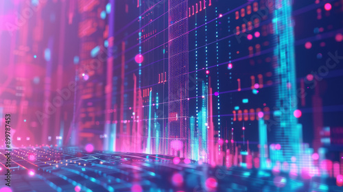 3D digital grid with floating data points and graphs
