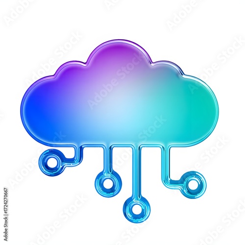 3D glass style purple blue cloud icon with circuit lines, representing cloud computing, storage, and networking