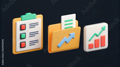 3d icons for business analytics, document organization, and task tracking
