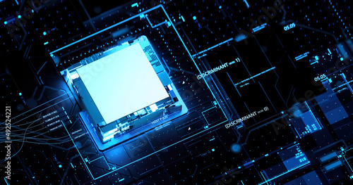 3D illustration cyberpunk AI skyscraper Circuit board. Technology background. Central Computer Processors CPU and GPU conception.