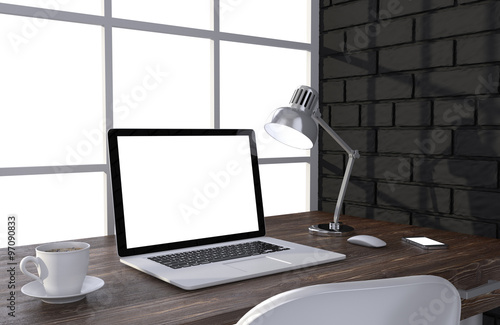 3D illustration laptop and work stuff on table near brick wall, Workspace