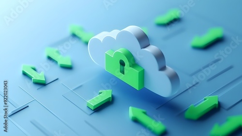 3D illustration of a cloud computing concept with a secured lock and directional arrows, representing data security and network connectivity.