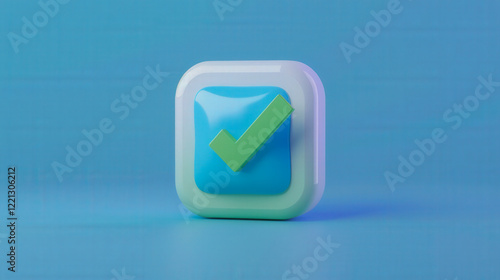 3D illustration of a green checkmark displayed on a blue and white cube, symbolizing approval, success, and task completion..