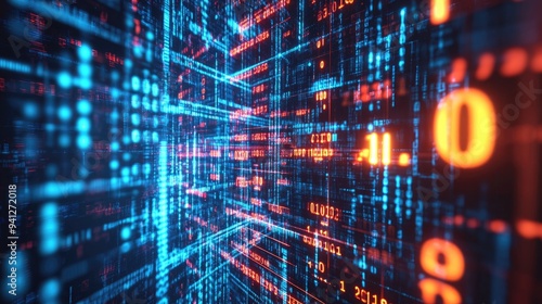 3D illustration of binary code representing a data processing concept related to advanced computing systems