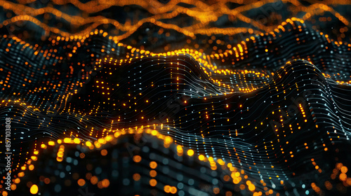 3D illustration of blockchain information flows in digital global networks data cells with binary code elementsglowing paths dark futuristic design