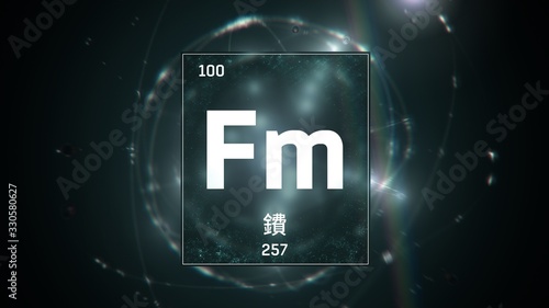 3D illustration of Fermium as Element 100 of the Periodic Table. Green illuminated atom design background with orbiting electrons name atomic weight element number in Chinese language
