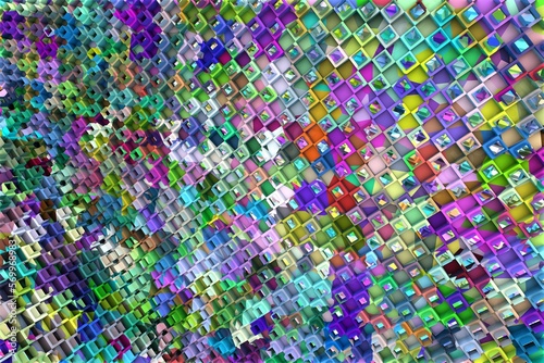 3D ILLUSTRATION RENDERING. ABSTRACT BACKGROUND SQUARE PATTERN DIMENSION OBJECT TRENDY COLORFUL GEOMETRY DISTORTED EFFECT GRAPHIC TEXTURE. PERSPECTIVE SCIENCE TECHNOLOGY PRESENTATION RANDOM DESIGN.