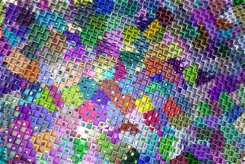 3D ILLUSTRATION RENDERING. ABSTRACT BACKGROUND SQUARE PATTERN DIMENSION OBJECT TRENDY COLORFUL GEOMETRY DISTORTED EFFECT GRAPHIC TEXTURE. PERSPECTIVE SCIENCE TECHNOLOGY PRESENTATION RANDOM DESIGN.