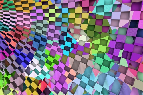 3D ILLUSTRATION RENDERING. ABSTRACT BACKGROUND SQUARE PATTERN DIMENSION OBJECT TRENDY COLORFUL GEOMETRY DISTORTED EFFECT GRAPHIC TEXTURE. PERSPECTIVE SCIENCE TECHNOLOGY PRESENTATION RANDOM DESIGN.