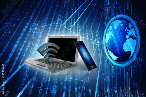 3d illustration WiFi symbol on laptop with mobile phone