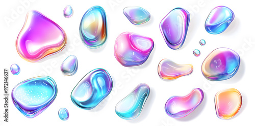 3d iridescent holographic liquid bubbles set isolated on white background