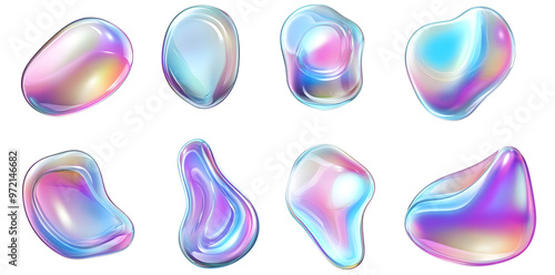 3d iridescent holographic liquid bubbles set isolated on white background