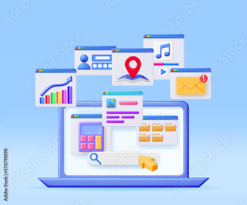 3D Laptop Application Windows Interface Isolated. Render Computer Software User Interface. UI Search, Music, Browser, Financial Calculator, File Manager Mail Notification Windows. Vector Illustration