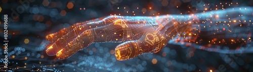 3D mesh hand gesturing with floating digital icons, smart technology interface, suitable for app developers.