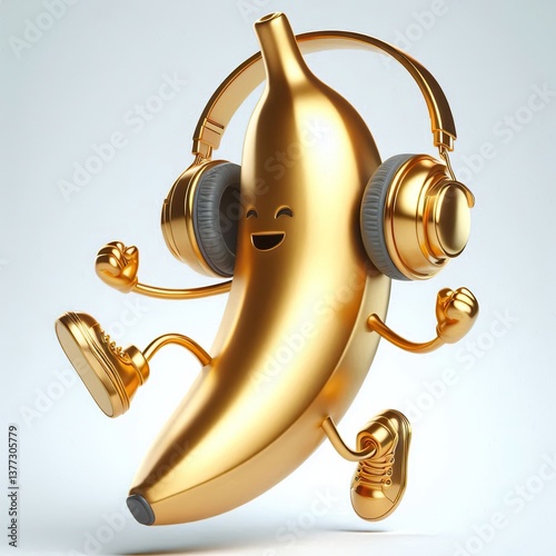 3d metallic realistic Golden banana character jumping with cool headphones on white background