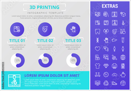 3D printing infographic template, elements and icons. Infograph includes customizable graphs, charts, line icon set with 3D printer, products of 3D innovation technologies, printing machine etc.