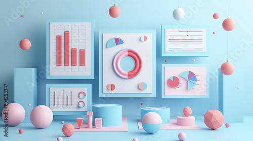 3d render colorful graph elements, PPT page design, multiple content plates, chart data comparison, retro futuristic style, minimalism, minimalist color matching, 3D elements