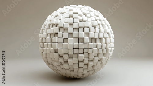 3D render of a spherical shape composed of floating random blocks, creating a dynamic abstract form with depth and modern digital style in vertical format.