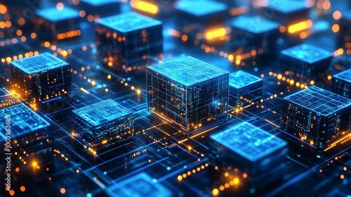 3D render of cube technology at the converging point of circuits against an abstract blue background. Blockchain network system for big data storage processing, cloud data, internet security, and digi