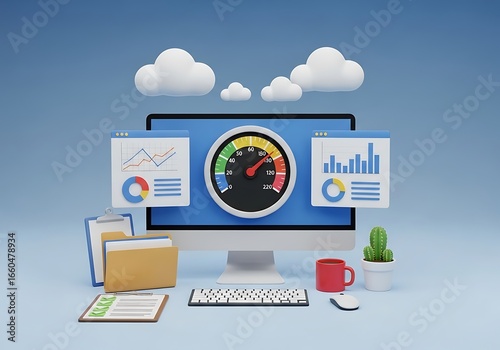 3D Rendered Desktop with Performance Dashboard and Data Visualization Clouds and Desktop Setup in Serene Blue Aesthetic