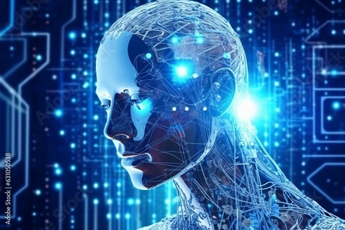 3d rendering humanoid robot in digital background with binary code, artificial intelligence concept