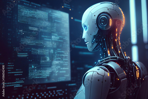 3d rendering humanoid robot working with computer code on dark blue background genrative ai