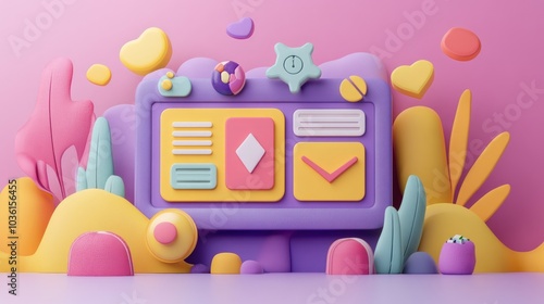 3D rendering of a colorful computer screen with various abstract shapes and icons.