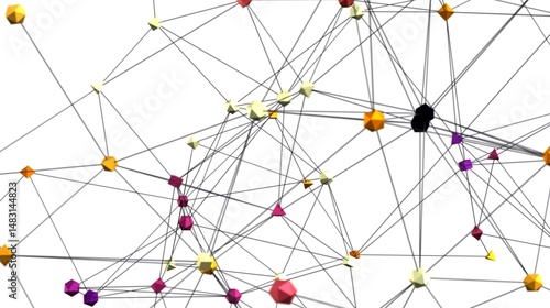 3D rendering of a complex network with colorful polygonal nodes and connecting lines. Ideal for technology, connection, and networking concepts.