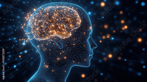 3D rendering of a human head with a glowing brain and a digital network on a dark blue background