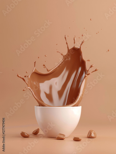 3D rendering of coffee splash in a white cup, creating an artistic effect with splashing liquid.