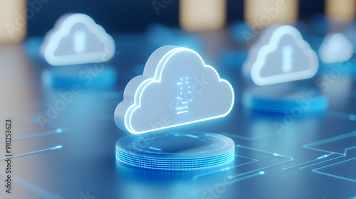 3D rendering of glowing cloud icons over a digital network. Concept for cloud computing, data storage, and technology.